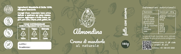 Crema di mandorle 100% naturale, realizzata esclusivamente con mandorle selezionate, senza aggiunta di conservanti né ingredienti artificiali. Dal gusto puro e dalla consistenza vellutata, è ideale per chi cerca un prodotto genuino e nutriente. Naturalmente priva di glutine e lattosio, è adatta a celiaci, vegani e a chi segue un’alimentazione attenta e consapevole. Perfetta da spalmare, per arricchire ricette dolci o da gustare al naturale.