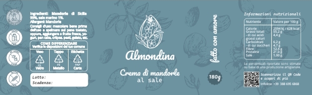 Crema di mandorle arricchita con sale di salgemma integrale, realizzata con ingredienti naturali e senza aggiunta di conservanti. Il gusto delicato e tostato delle mandorle si esalta grazie alla nota minerale del sale, creando un equilibrio armonioso e deciso. Naturalmente priva di glutine e lattosio, è adatta a celiaci, vegani e a chi soffre di intolleranze. Ideale da spalmare, da gustare al naturale o per dare carattere a ricette dolci e salate.